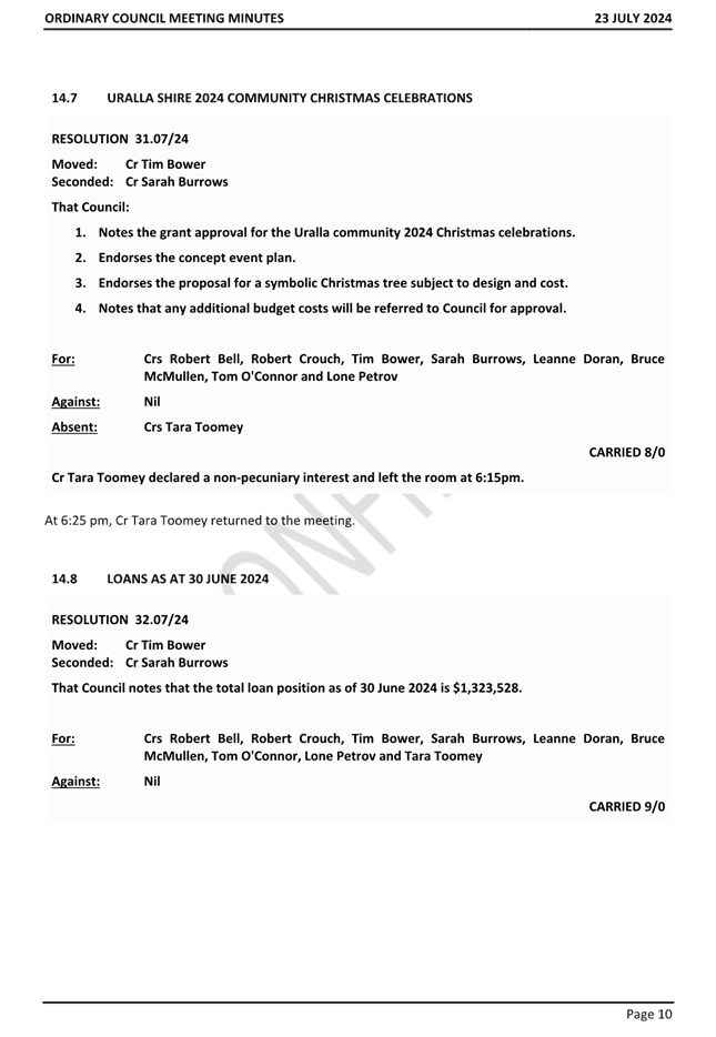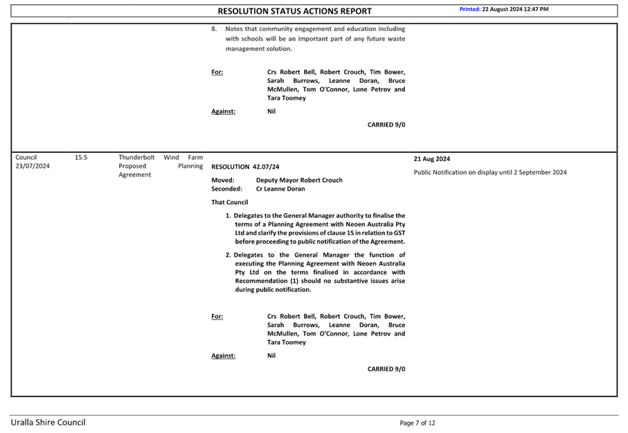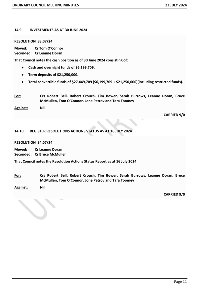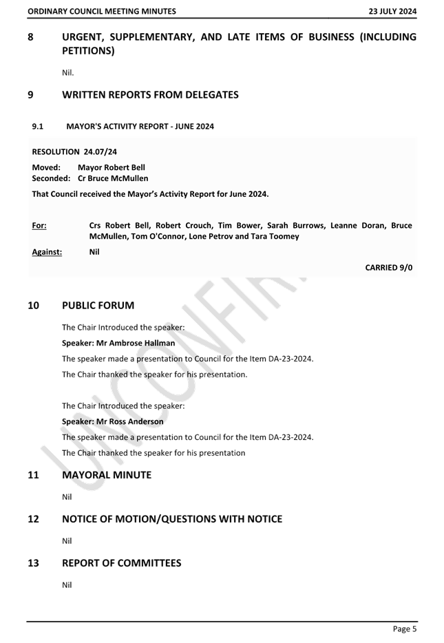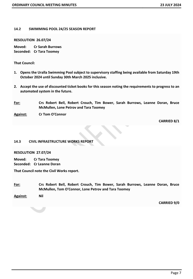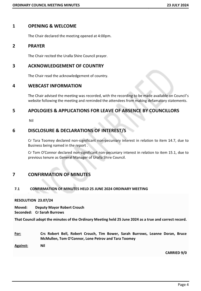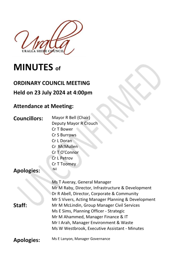 7.1 Confirmation of Minutes held 23 July 2024 Ordinary Meeting