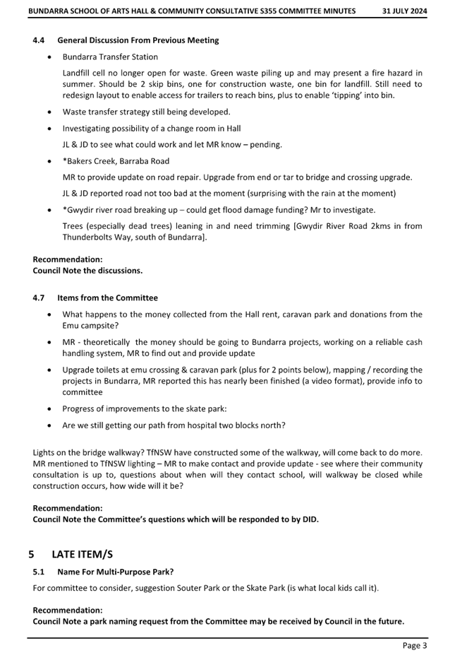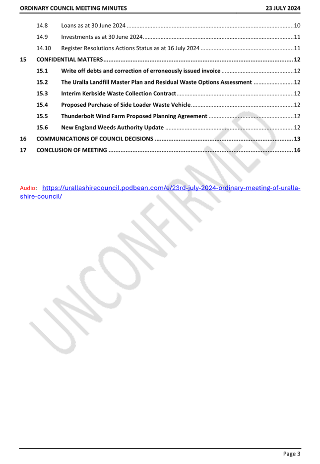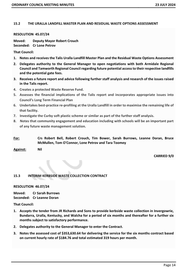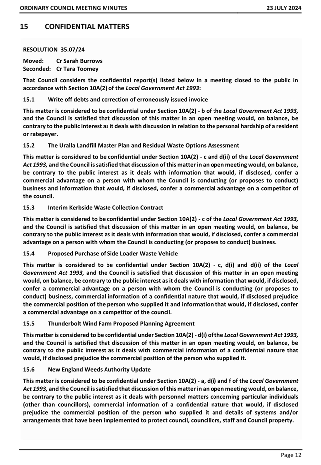 Councillor Workshop & Debriefing Sessions - Grant Opportunity EV Charger - GP (Uralla Doctor) update - Animal Management Policy review - DA boundary adjustment - Waste Truck update - Fibonacci Installation update - Courthouse future - Recycling Solar Panels |