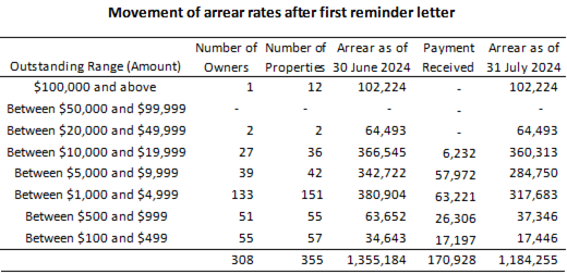 The first reminder letter was sent on July 16 2024 to 498 property owners with outstanding rates over $100 as of June 30, 2024. Council has recovered $170,928 following this reminder. Further, 23 requests for payment arrangements were requested with 13 finalised, totalling $48,000 in outstanding rates that will be recovered through weekly to monthly repayments. The outstanding rate position following the first reminder letters is $1,184,255 (refer to the Table below: Movement of arrear rates after first reminder letter).