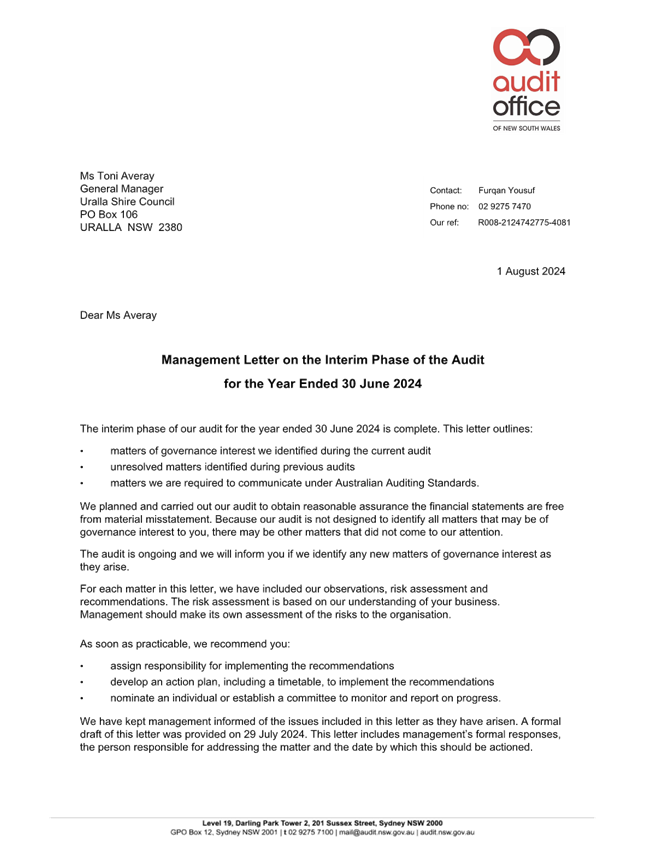 The Interim Audit Management letter for 30 June 2024 was received on 2nd August 2024.