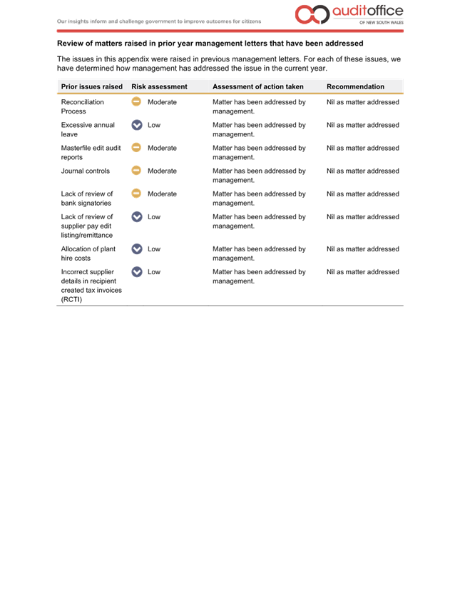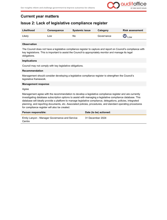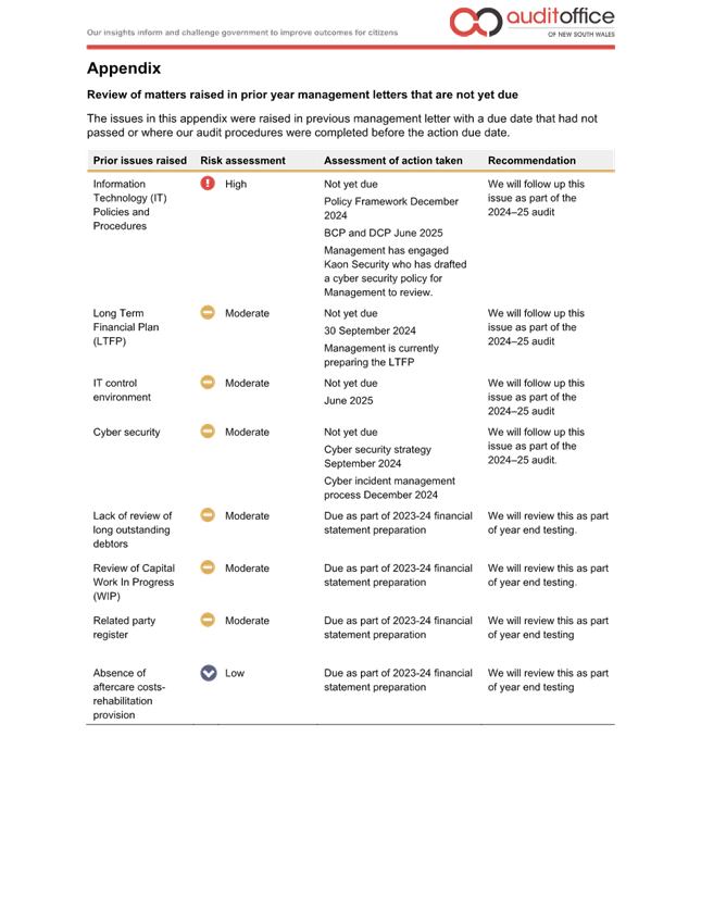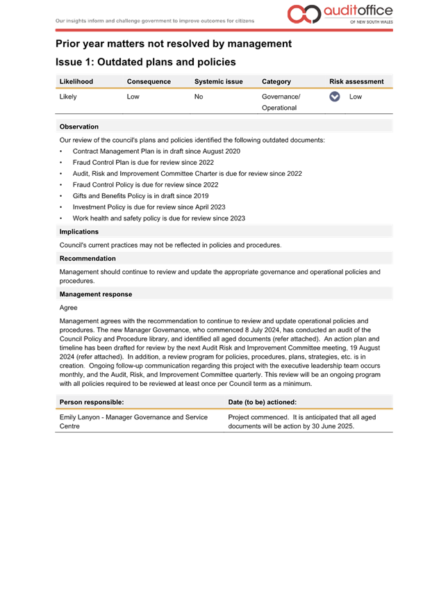 1. A Summary Report was presented at the Audit, Risk & Improvement Committee (ARIC) meeting 17 June 2024 for noting and seeking additional guidance. A further status update will be provided to ARIC in August.