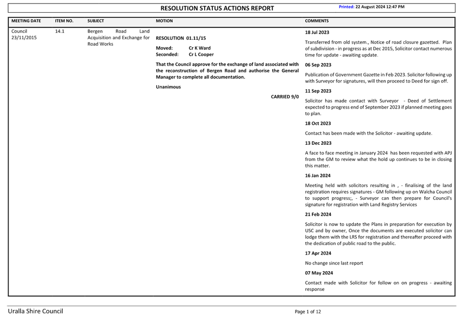The Resolutions Action Status Report is presented to Council at each Ordinary Meeting.