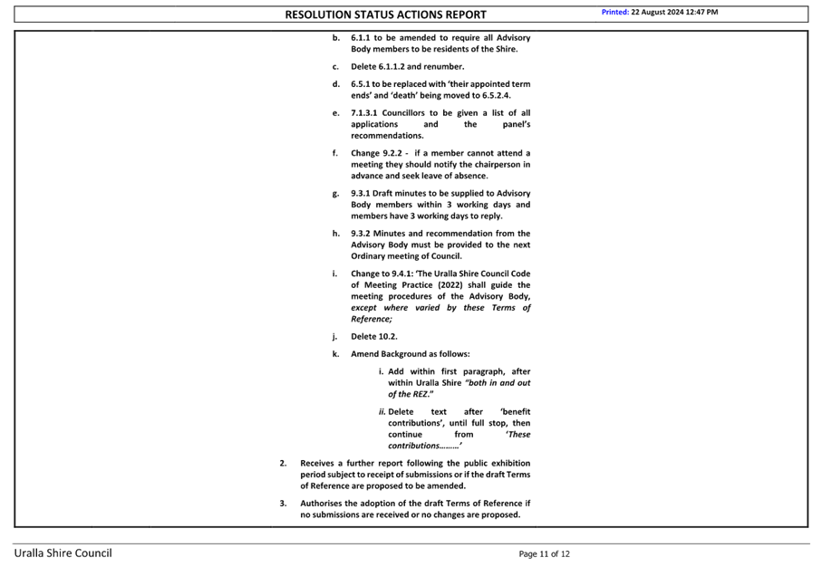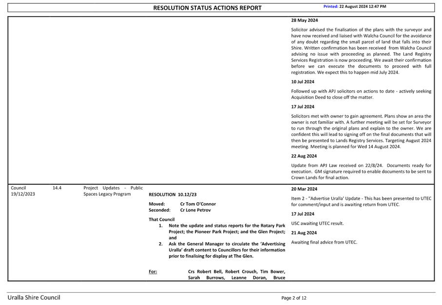 Following every council meeting, the resolutions of Council which require action are compiled. This document is referred to as the Resolutions Action Status Report.