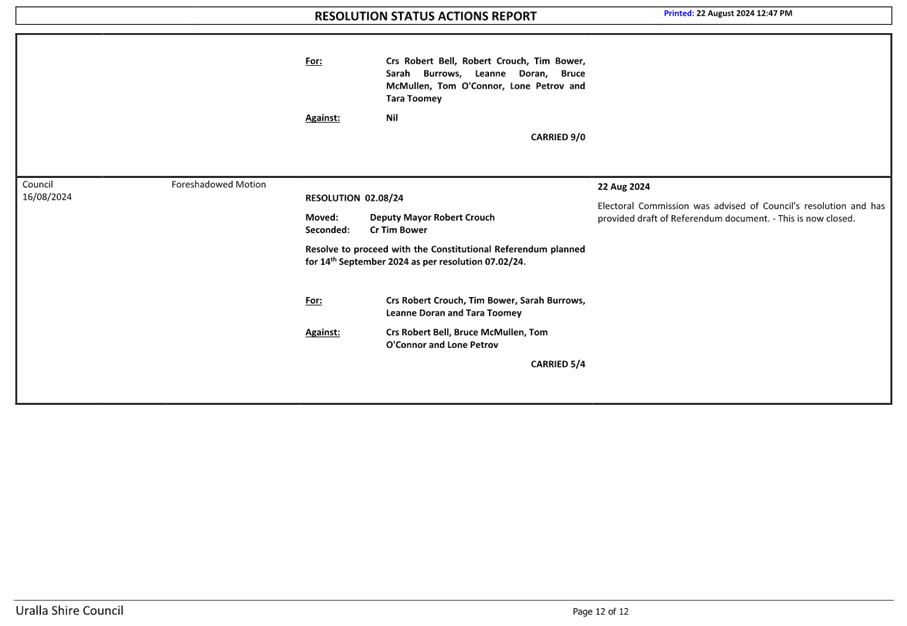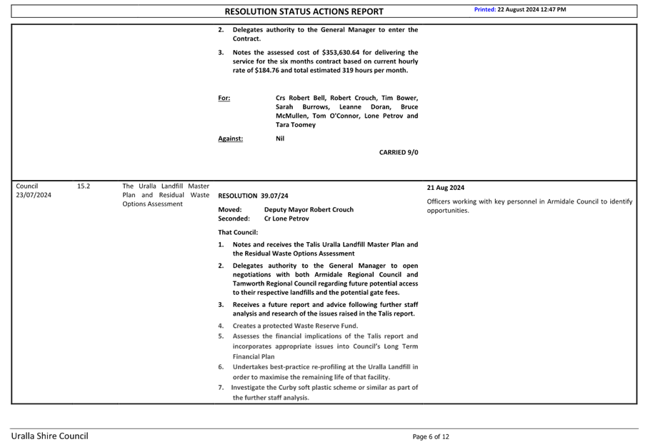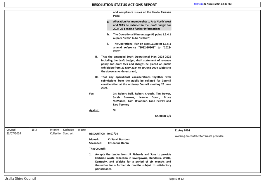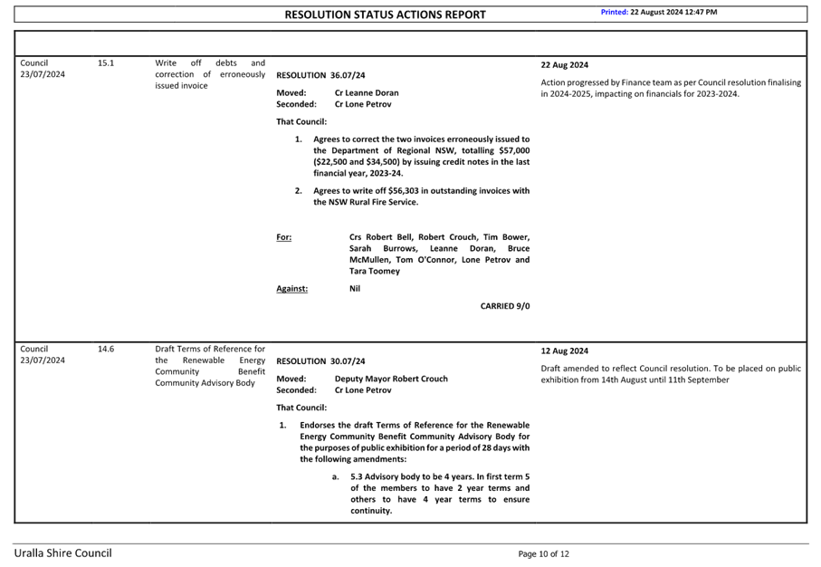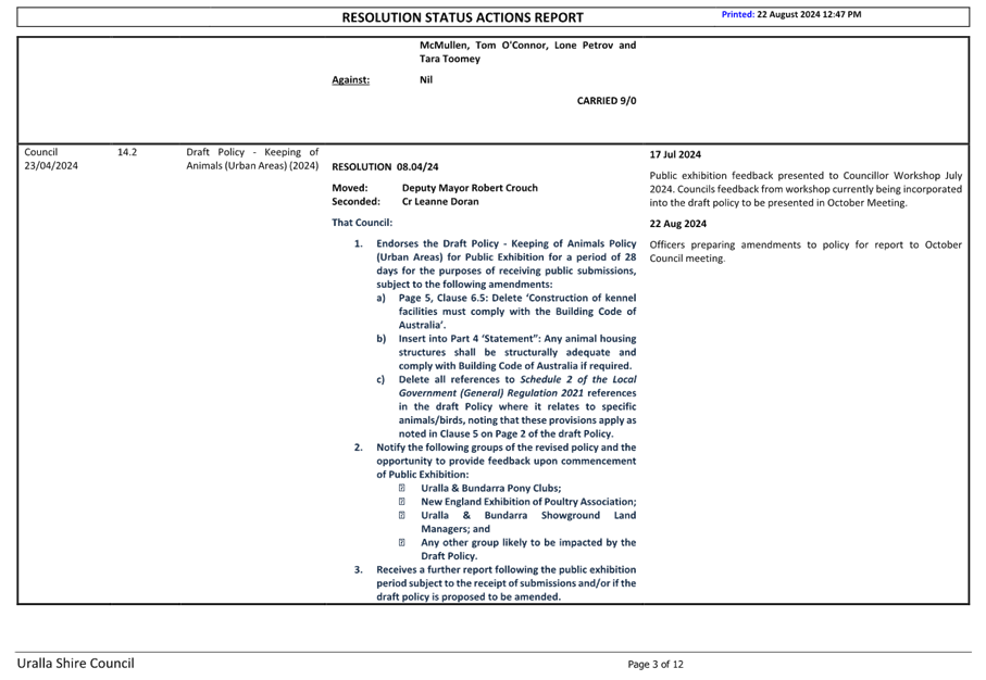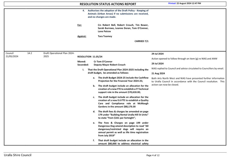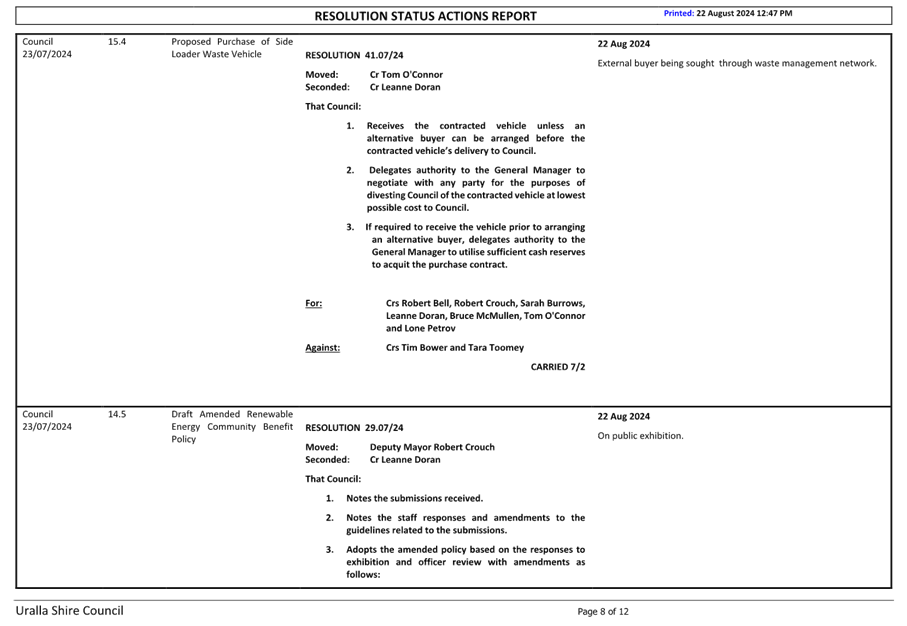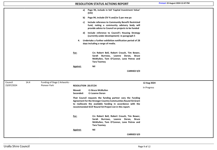 14.9 Register Resolutions Actions Status as at 22 August 2024